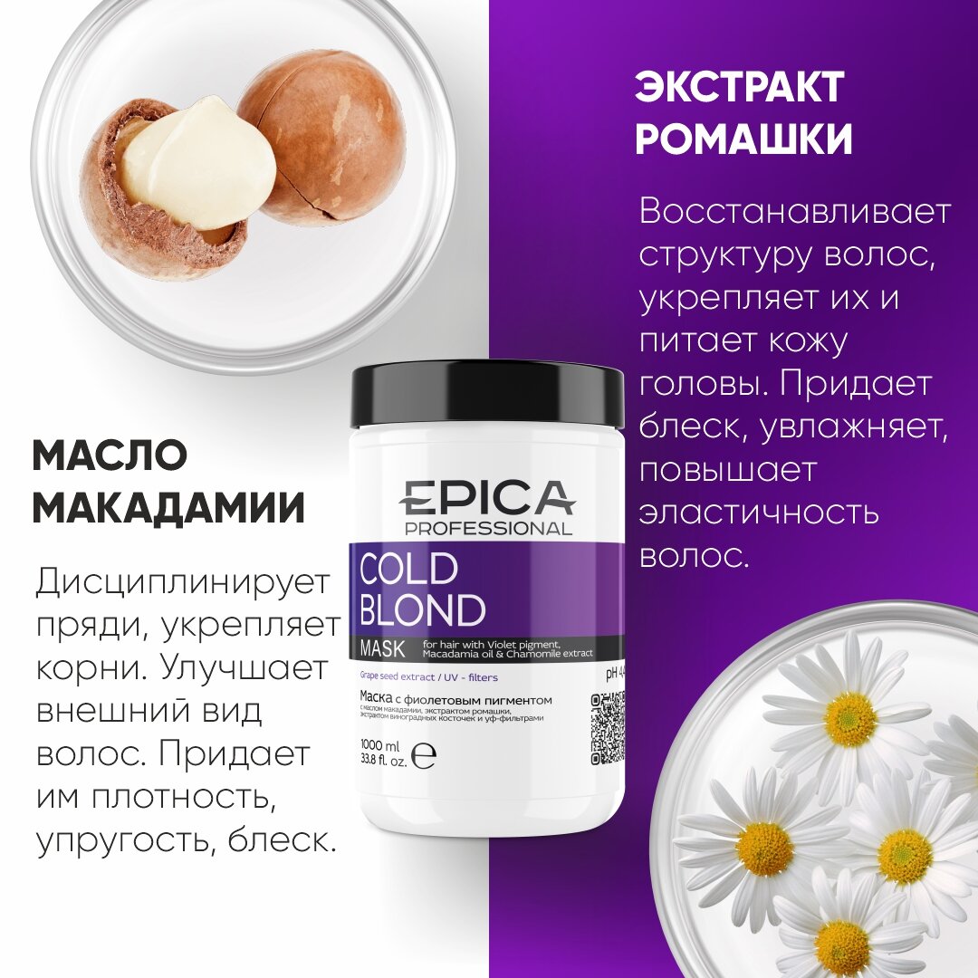 | Комплектация | EPICA Professional Cold Blond Маска с фиолетовым пигментом, маслом макадамии и экстрактом ромашки, 1000 мл. |
