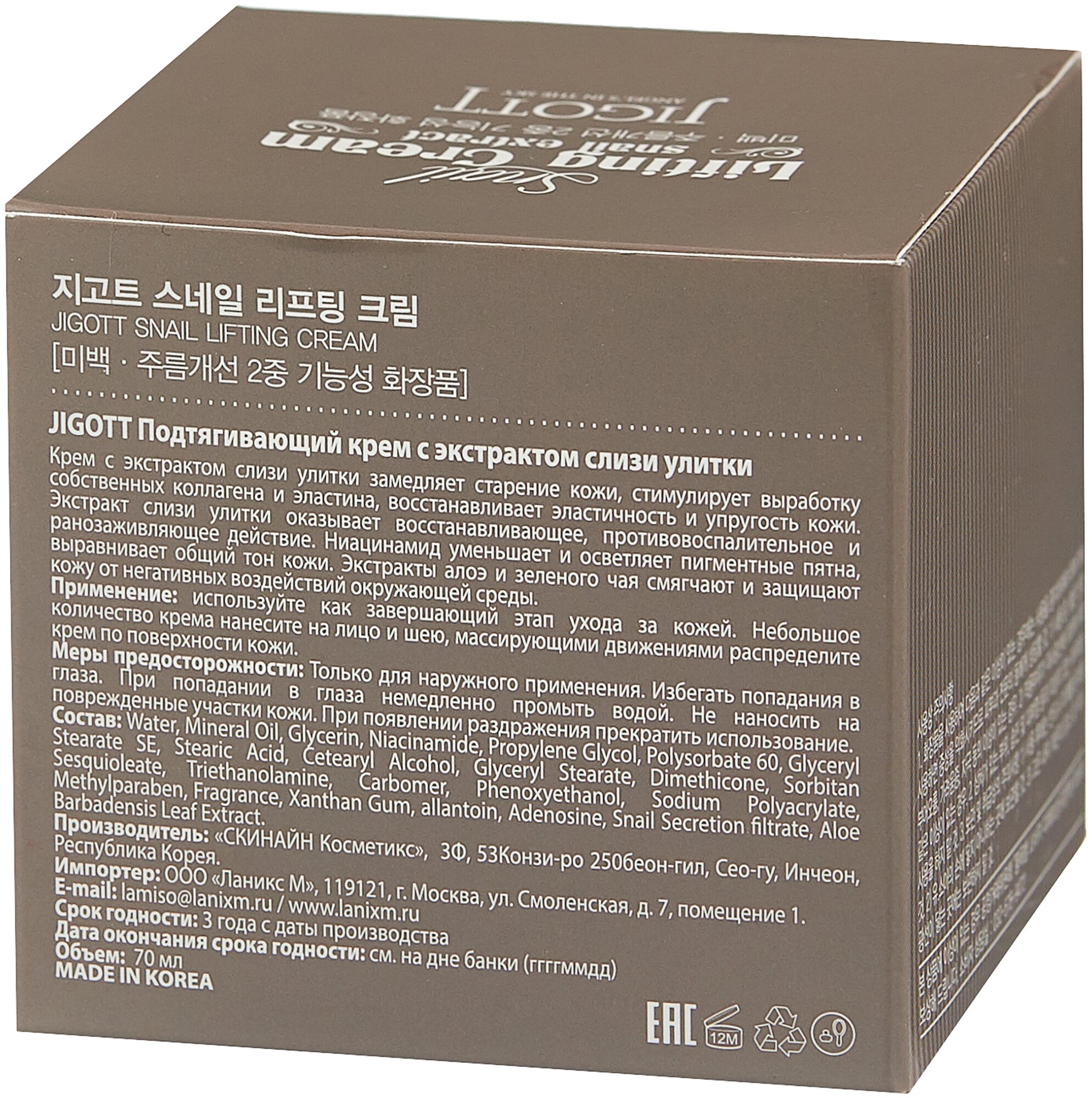 Jigott Подтягивающий крем для лица с экстрактом слизи улитки Snail Lifting Cream, 70 мл информация: