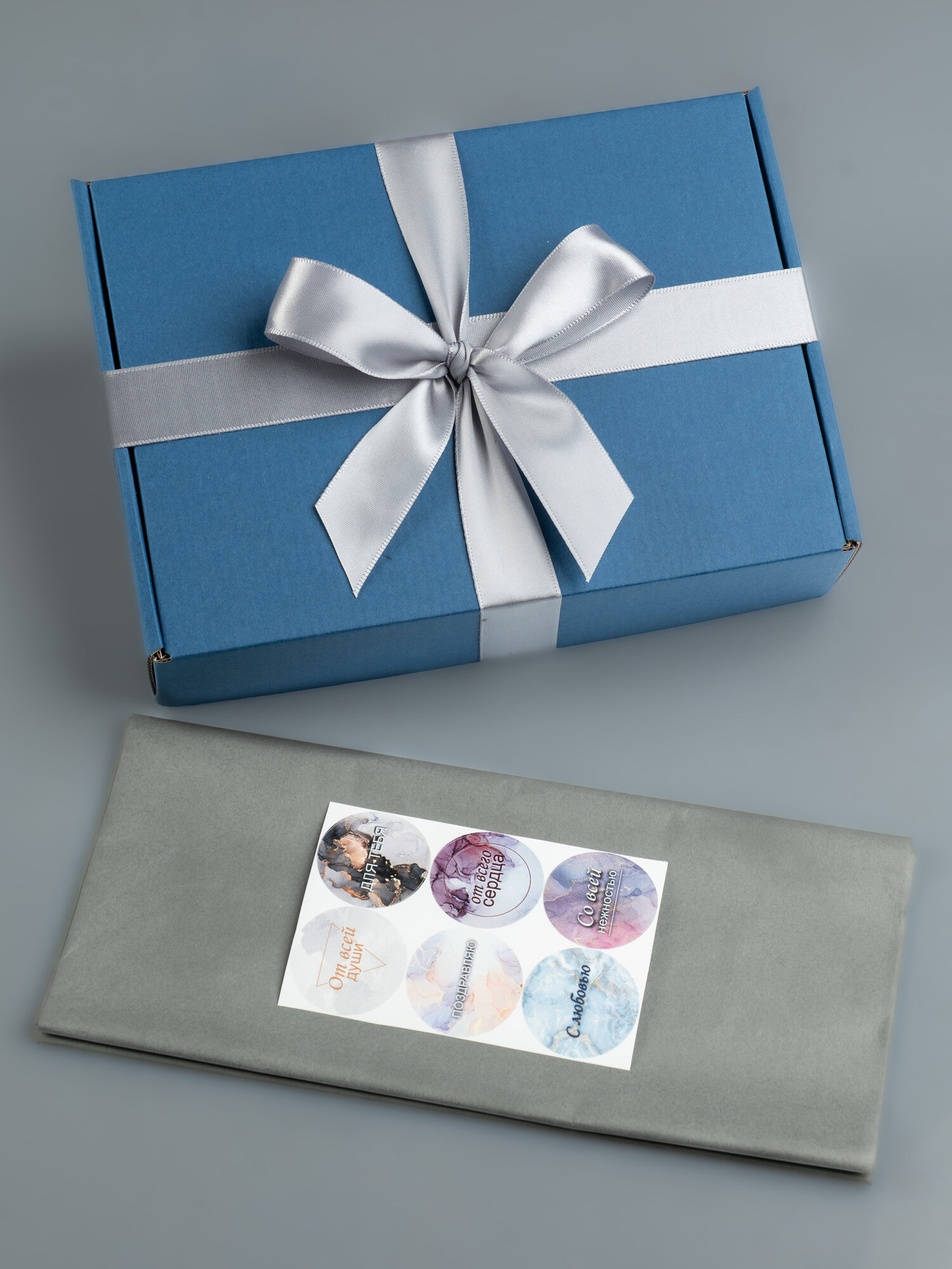 | Комплектация | 1 крафтовая коробка черная, бумага тишью, сатиновая лента 1.5м, набор наклеек для любой категории людей. |