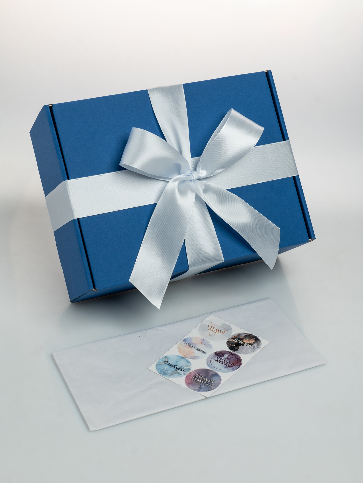 | Комплектация | 1 крафтовая коробка черная, бумага тишью, сатиновая лента 1.5м, набор наклеек для любой категории людей. |