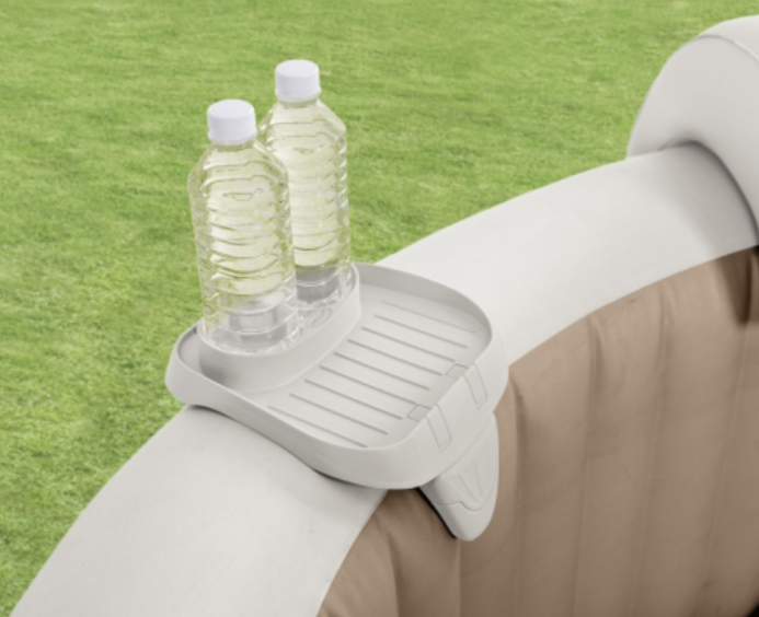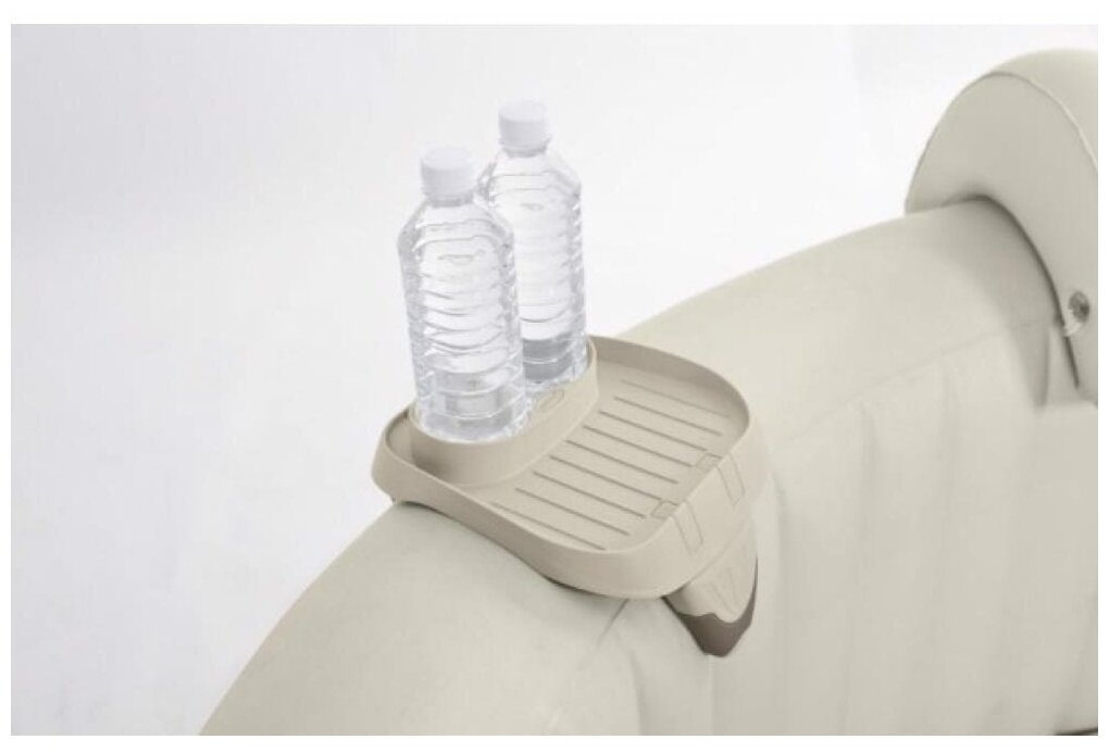| Дополнительная информация | Подстаканник с поддоном используется для надувных джакузи Intex. Благодаря специальной форме и наличию резиновой основы надежно крепиться к джакузи. Позволяет ставить две ёмкости стандартных размеров с напитками, закуски, телефон или часы. Легко снимается и устанавливается. Сделан подстаканник PureSpa Cup Holder из высококачественного пластика, в той же цветовой гамме, что и внутренняя часть бассейна. |