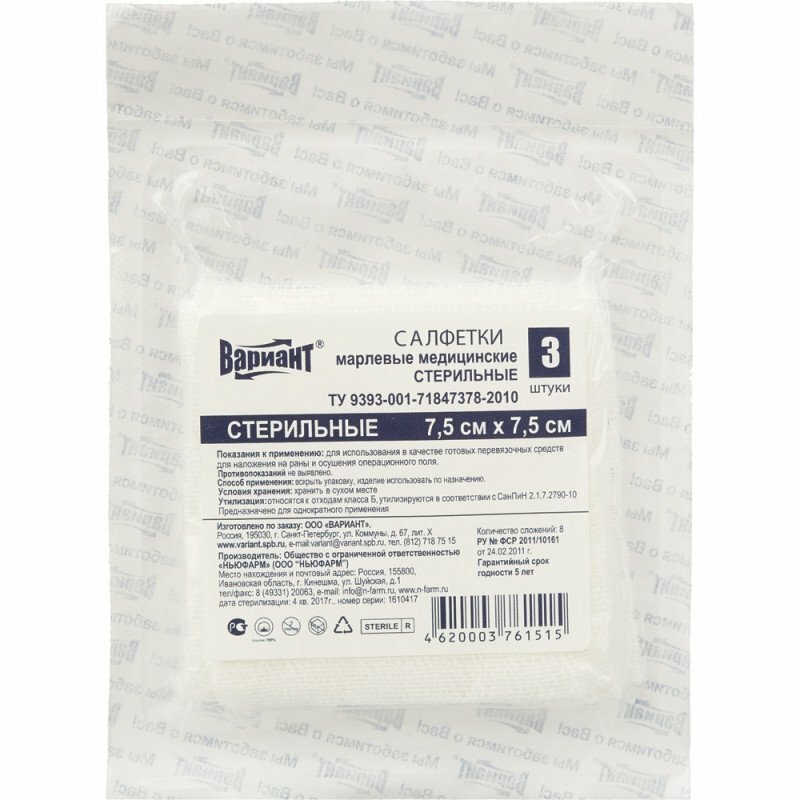 Салфетка стер 7,5х7,5см 8сл 17нитей 3шт/уп Вариант