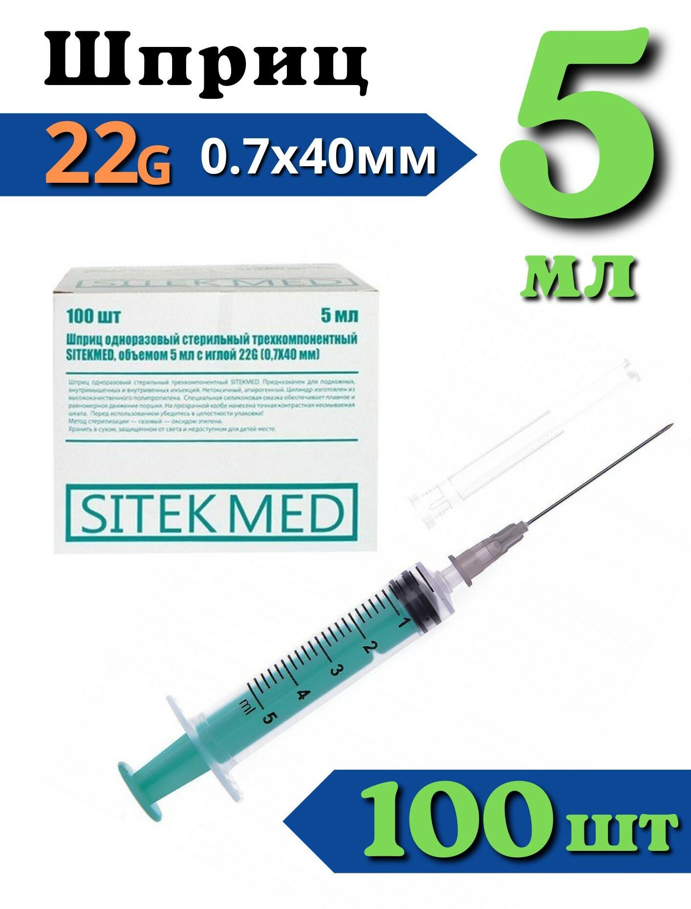 Шприцы 5 мл Sitekmed трехкомпонентный луер игла 22G - 100 шт информация: