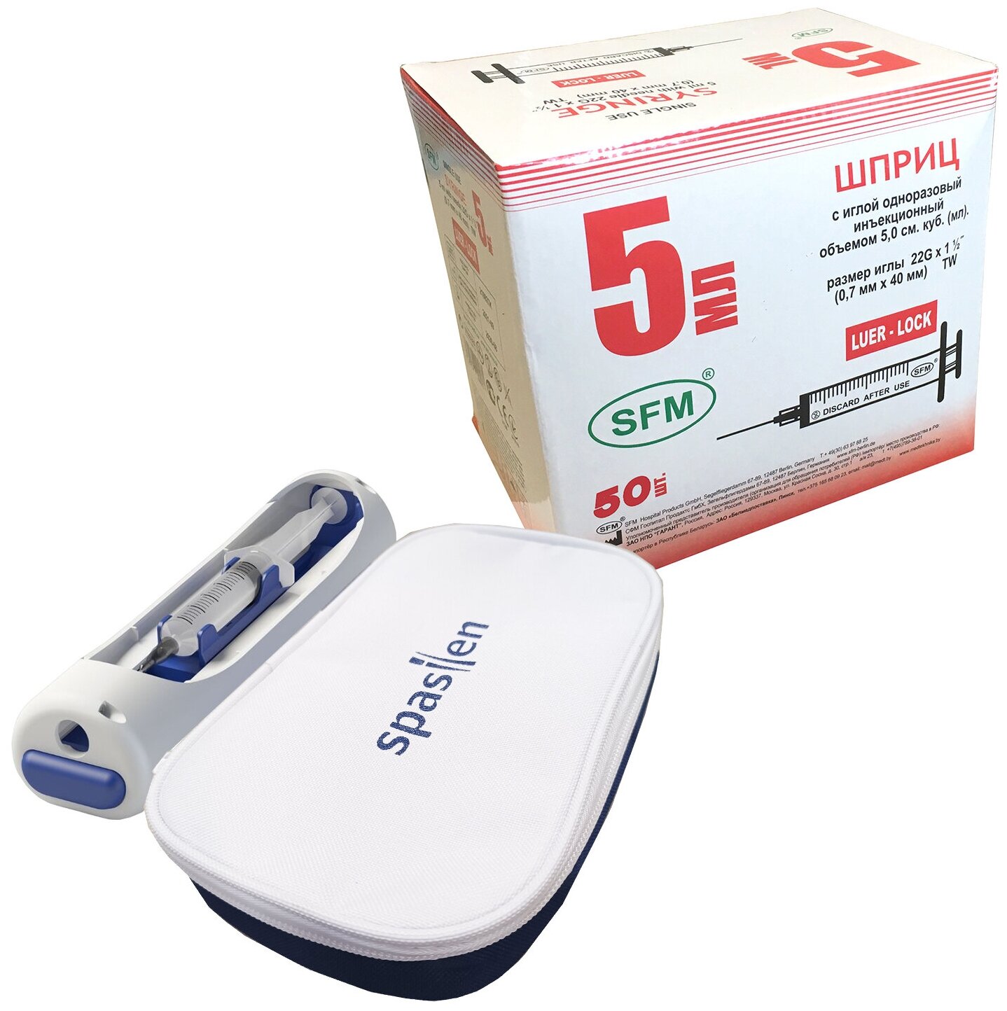 Автоматический инъектор Spasilen с чехлом органайзером + Шприц медицинский 5мл комплект 50 шт SFM Luer (3-х компонентный), игла 0,7 x 40 - 22G информация: