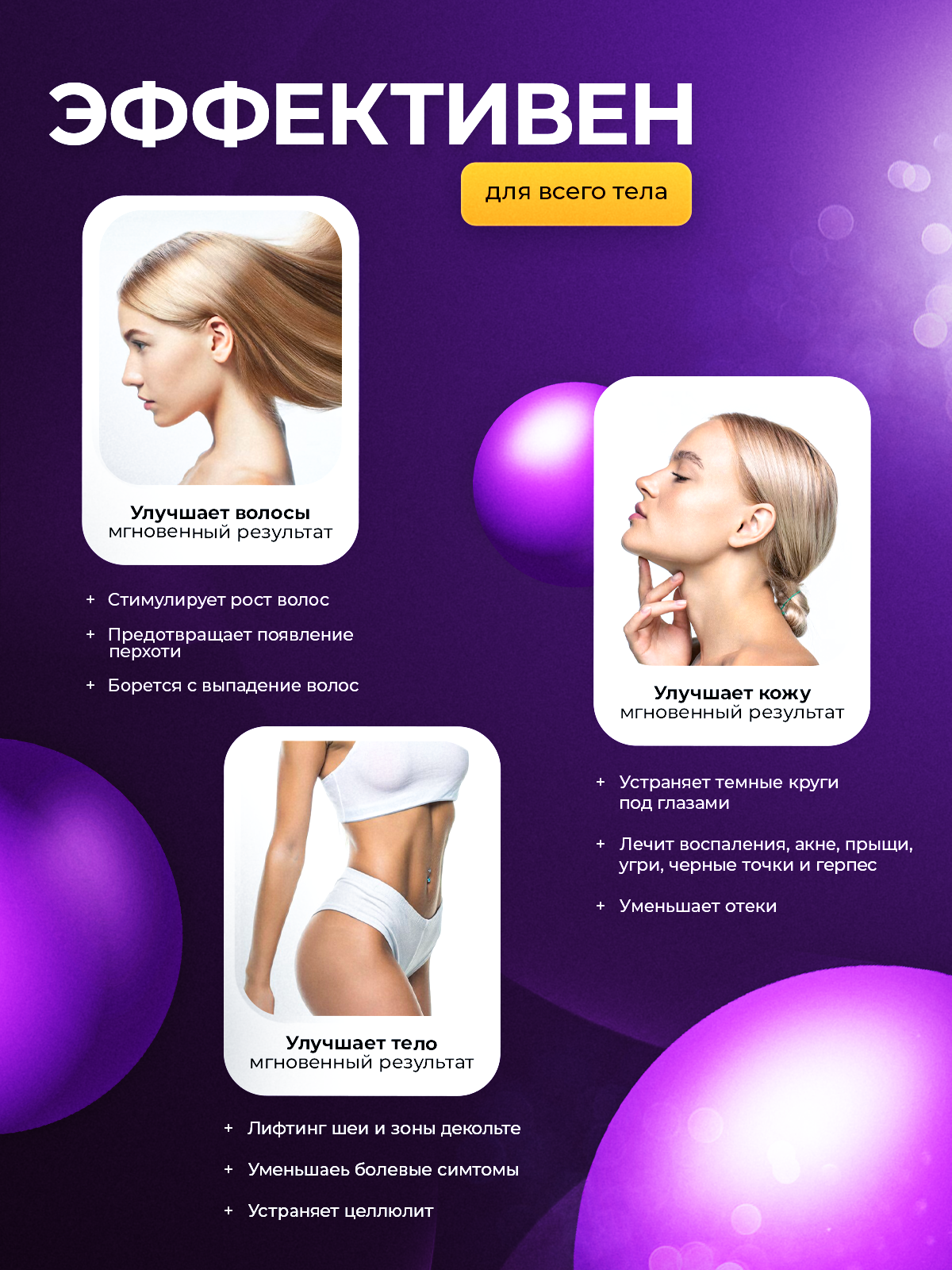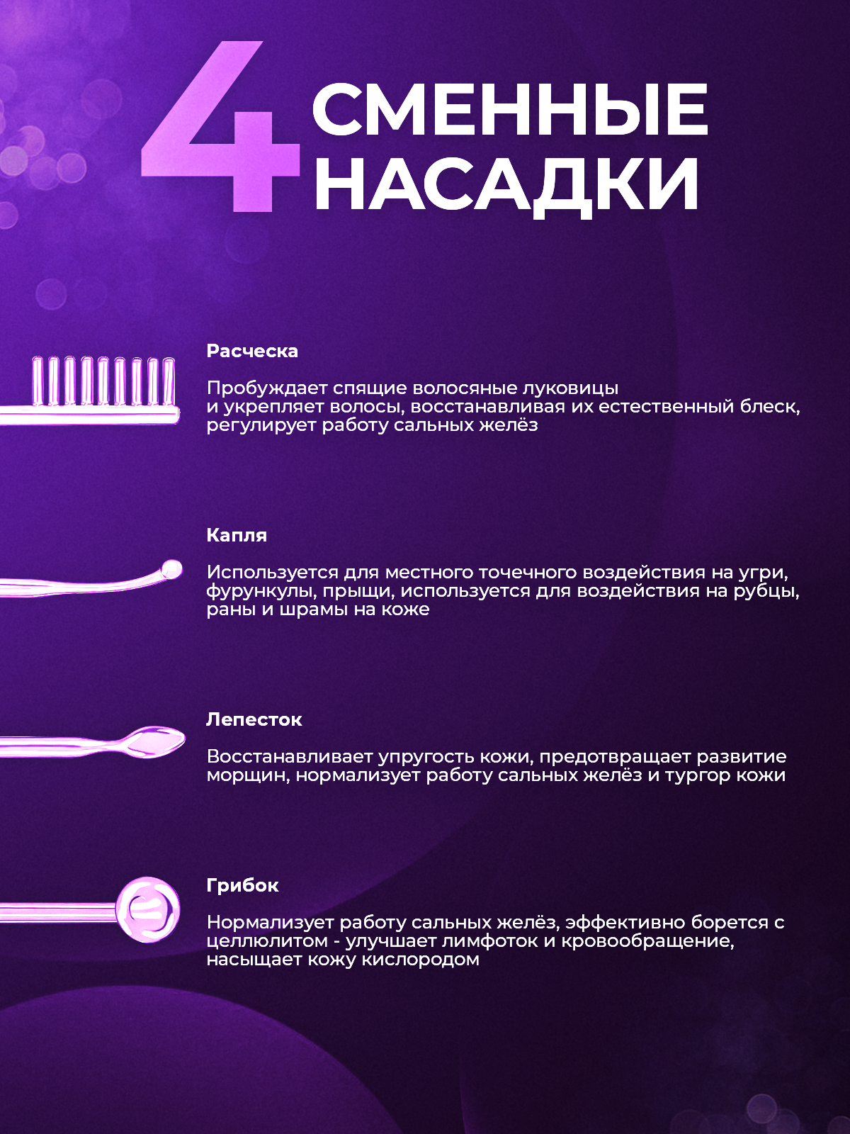 | Назначение | антивозрастной уход / антицеллюлитный уход / лечение акне / массаж / очищение / терапия заболеваний уха / улучшение состояния волос |