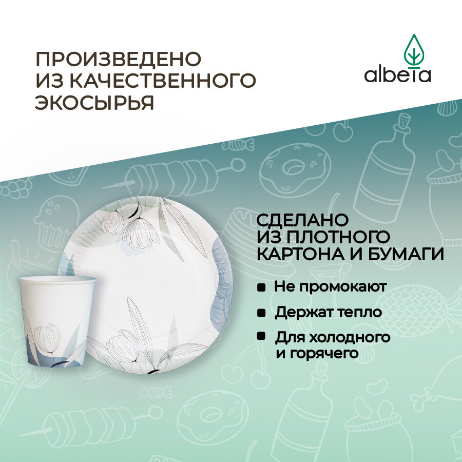 Одноразовая посуда, вилки, ножи, стаканчики, бумажные тарелки, набор одноразовой посуды для пикника и праздника на 10 персон, принт "Тюльпаны" 350 ₽
