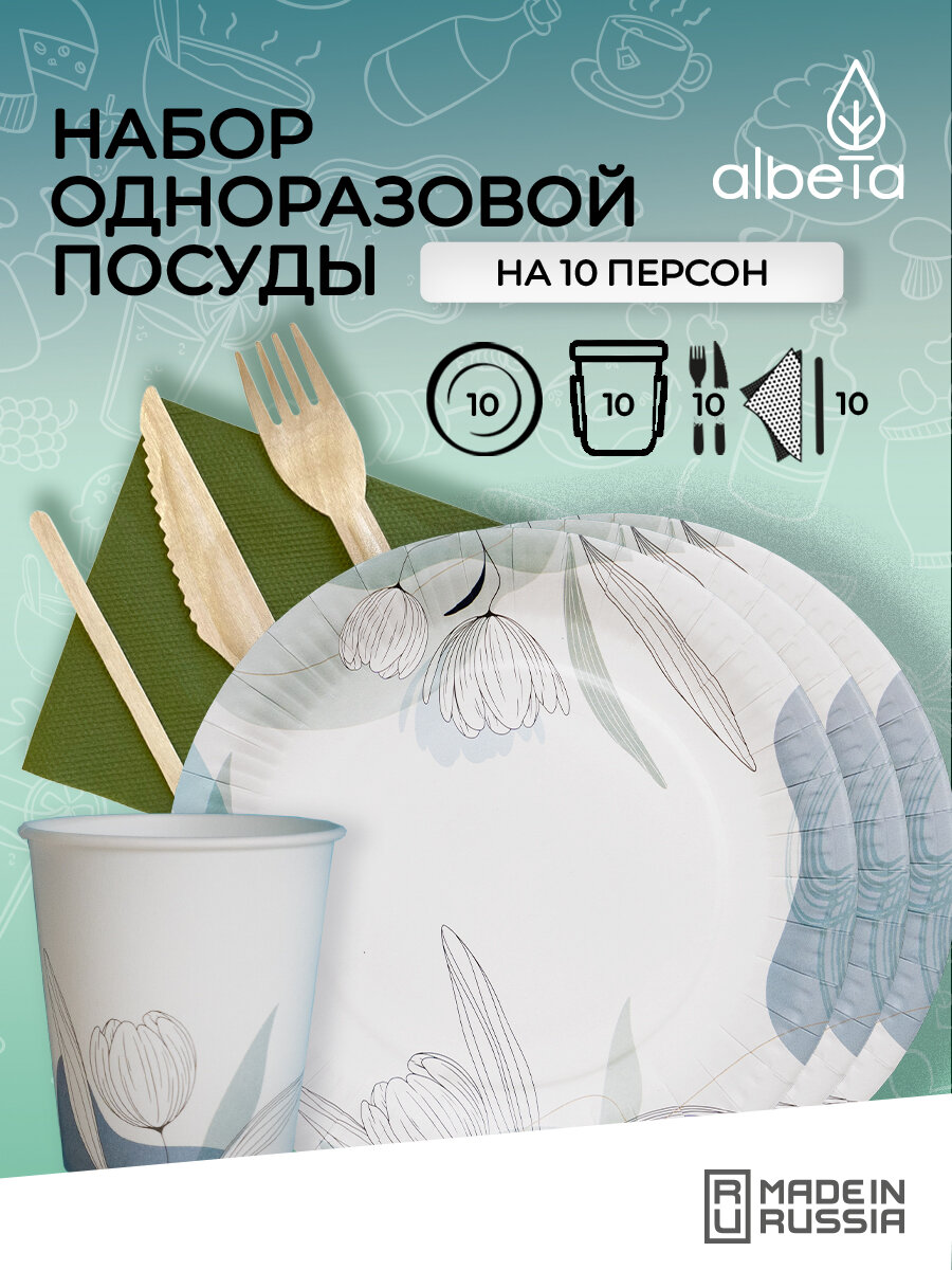 10 цен на Одноразовая посуда для праздника (тарелки, стаканчики, вилки, ножи) набор на 10 персон, принт "Тюльпаны"