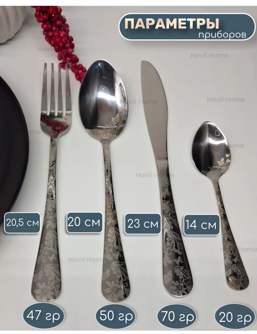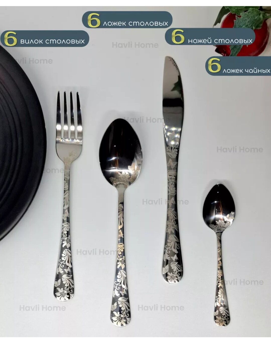 | В набор входит | Комплектация: Ложки столовые - 6 штук/ Вилки столовые - 6 штук /Ложки чайные - 6 штук/Ножи столовые - 6 штук |
