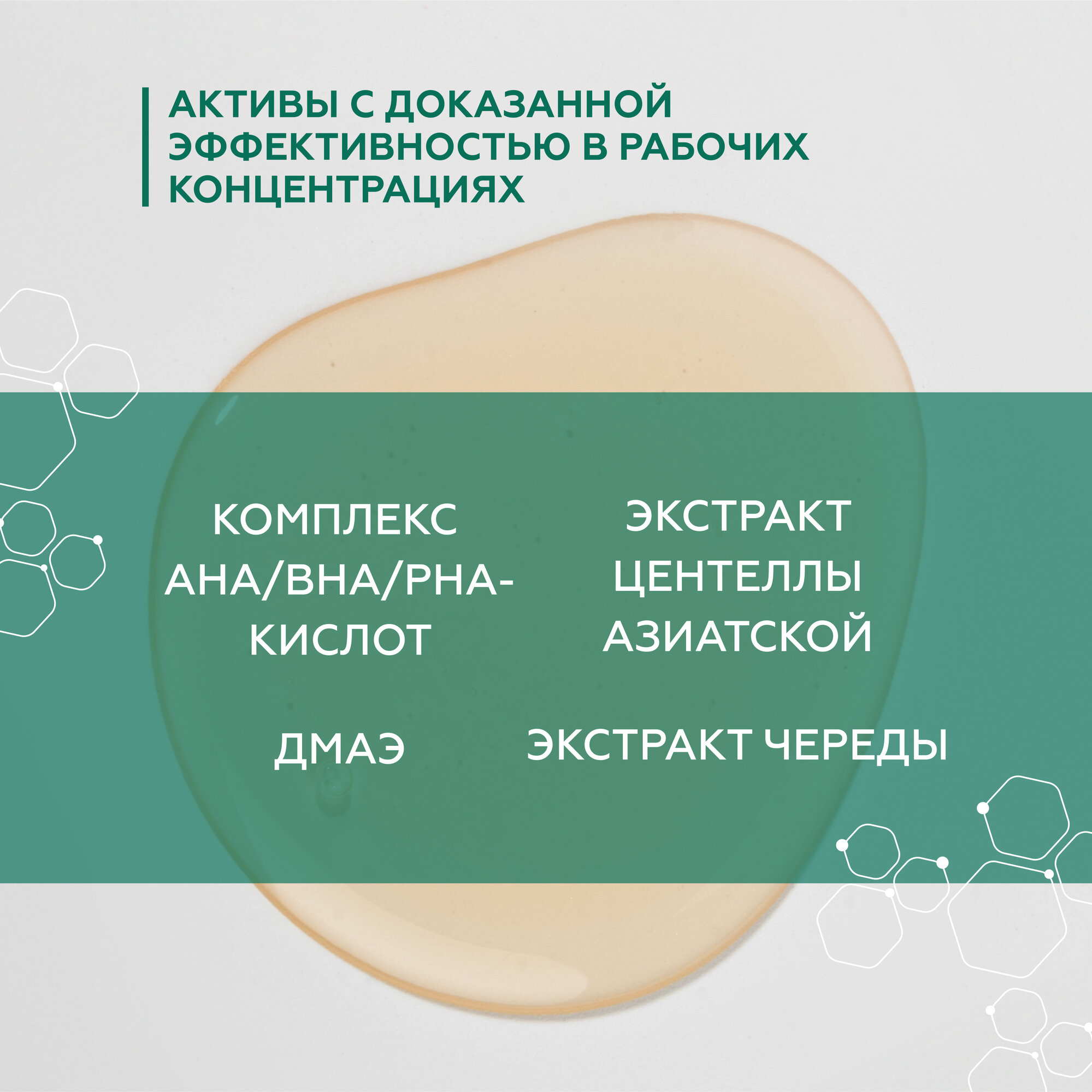 | Активный ингредиент | AHA-кислоты / PHA-кислоты / миндальная кислота / молочная кислота / салициловая кислота / центелла азиатская |