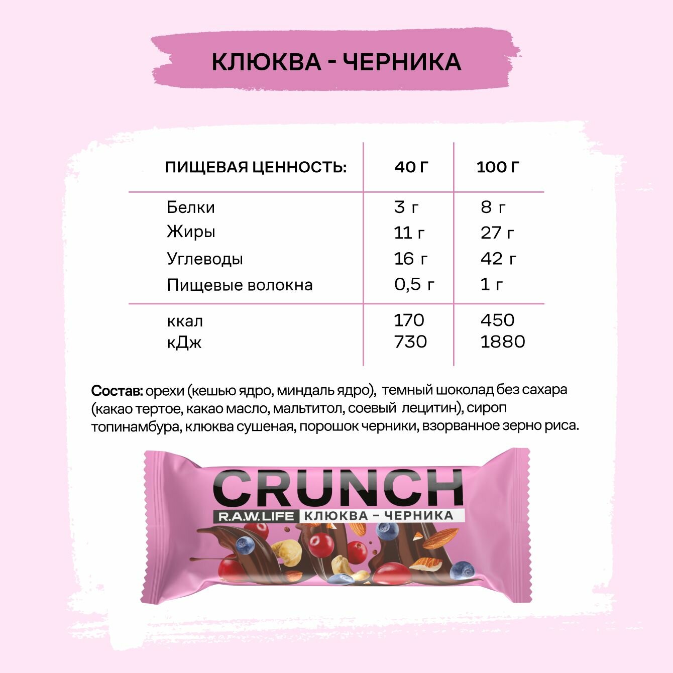 Отзывы на Энергетические батончики без сахара R.A.W.LIFE CRUNCH с бельгийским шоколадом / Злаковые, натуральные, много орехов / Клюква-Черника 12 шт по 40 гр