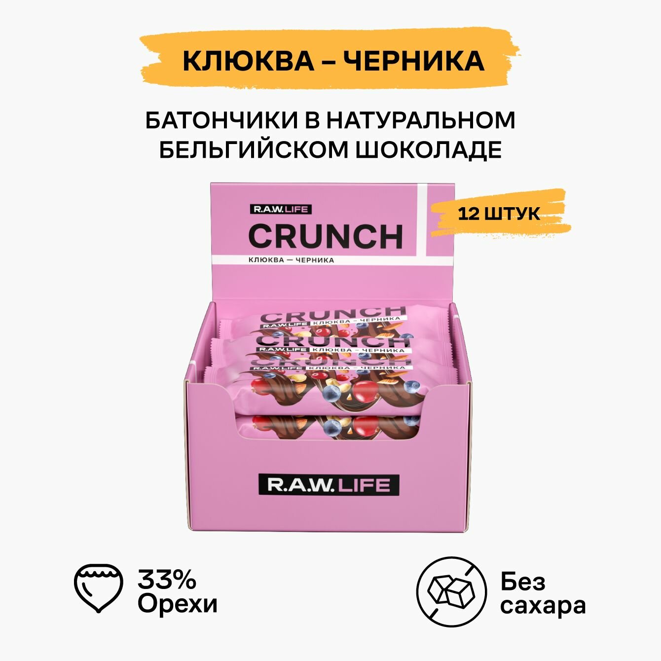 Энергетические батончики без сахара R.A.W.LIFE CRUNCH с бельгийским шоколадом / Злаковые, натуральные, много орехов / Клюква-Черника 12 шт по 40 гр информация: