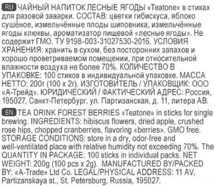 Чай фруктовый 100 стиков по 2 г Teatone Лесные Ягоды, 1 упаковка информация: