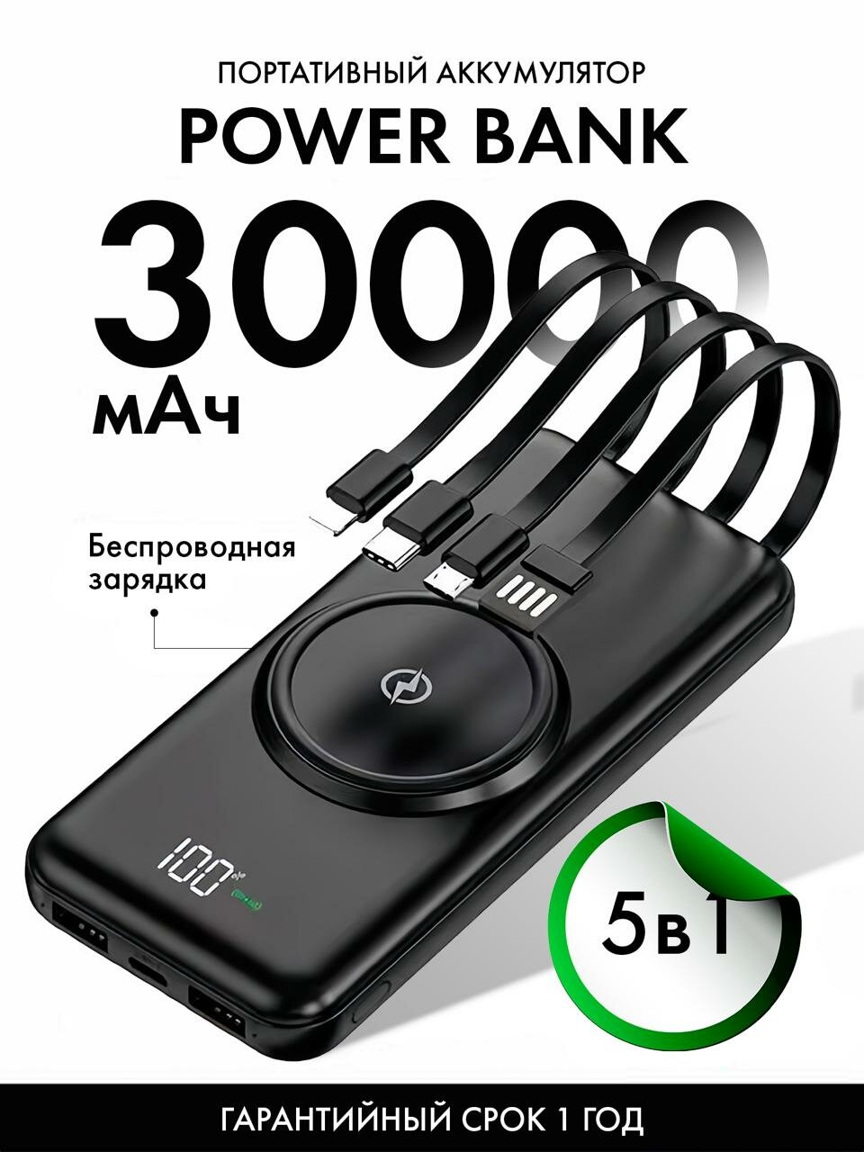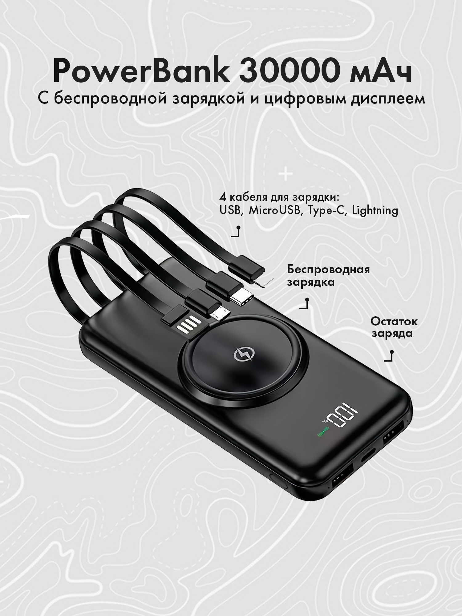 Повербанк с беспроводной зарядкой на 30000mAh и 4-мя встроенными кабелями информация: