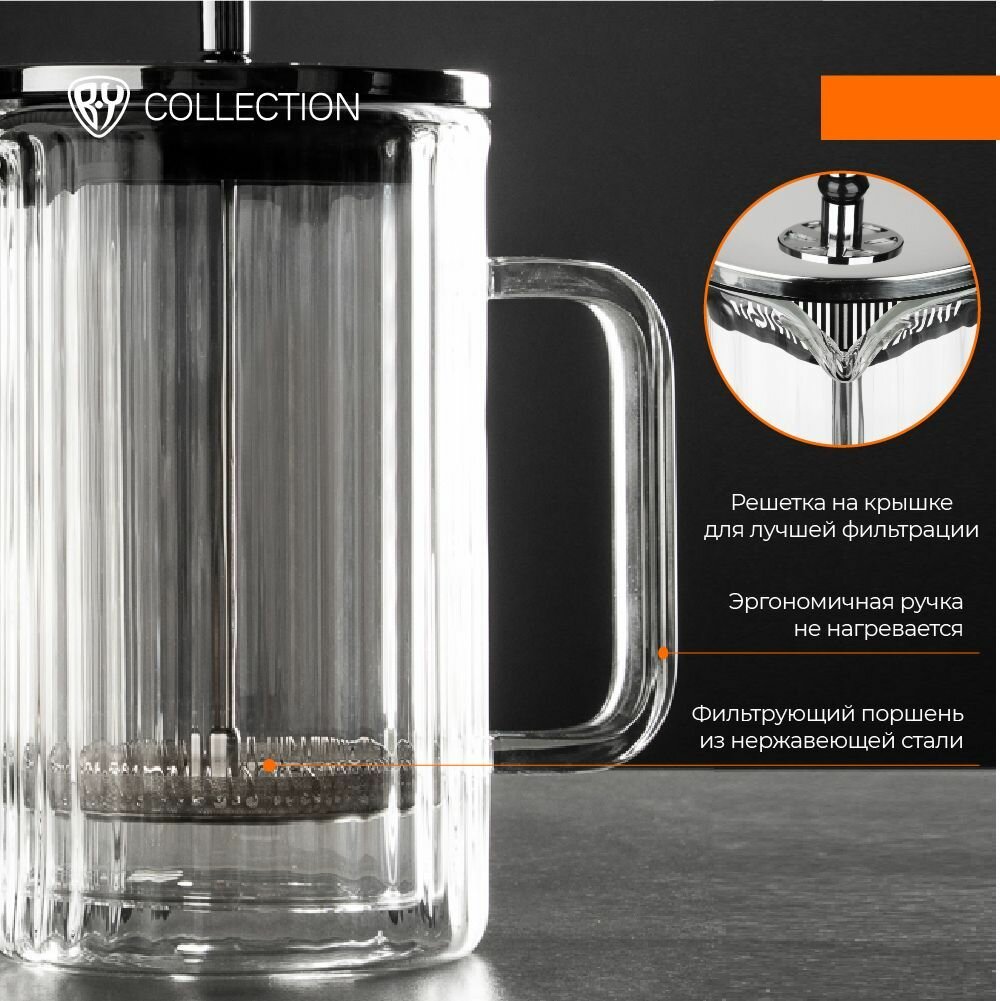 Френч-пресс с двойными стенками 600 мл BY COLLECTION Kiver, жаропрочное стекло, заварочный чайник для кофе и чая информация: