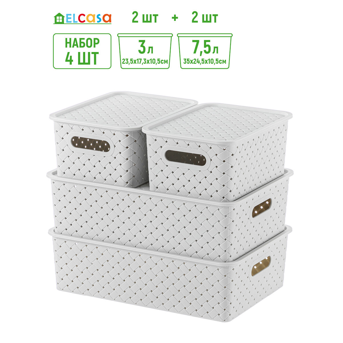 Корзинка, коробка для хранения, с крышкой 4 шт Береста 3 л (2 штуки) и 7,5 л (2 штуки) El Casa, цвет светло-серый, набор информация: