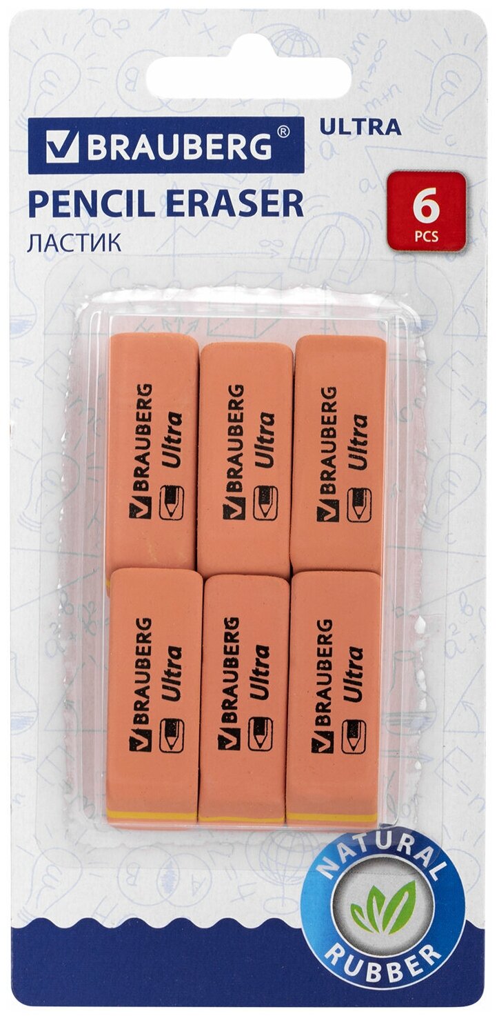 Ластики BRAUBERG "Ultra" набор 6 шт., размер ластика 41х14х8 мм, оранжевые, натуральный каучук, 229601