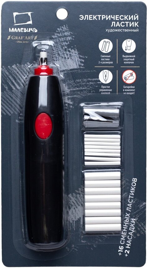 | Дополнительная информация | Ластик электрический - 1шт, 16 сменных ластиков (2 толщины), 2 сменные насадки |
