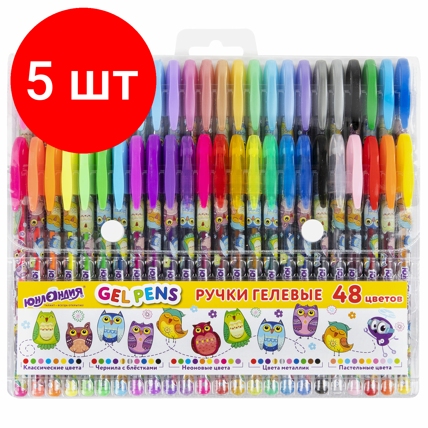10 цен на Комплект 5 шт, Ручки гелевые набор 48 цветов, юнландия, корпус с печатью, узел 1 мм, линия письма 0.5 мм, 143820