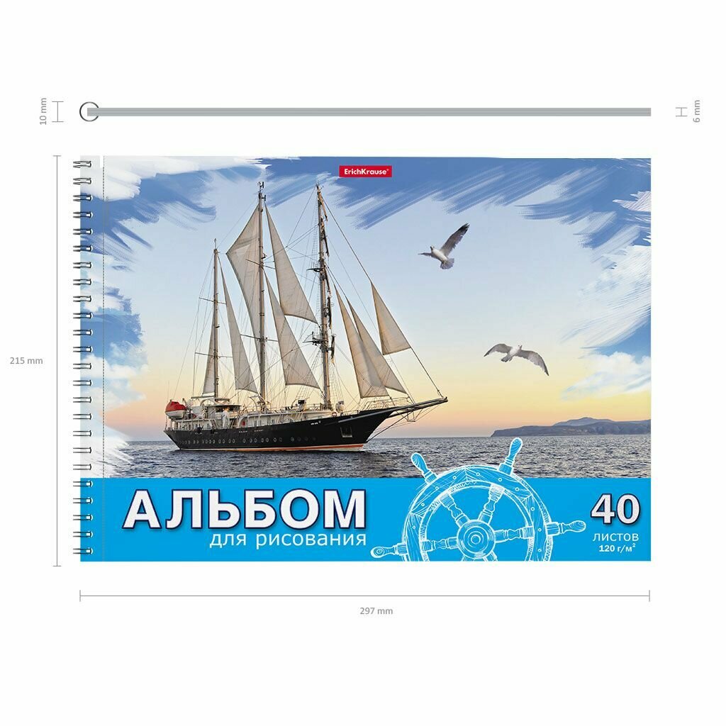 Альбом для рисования А4, 40 листов, блок 120 г/м², на спирали, Erich Krause Морская прогулка, 100% белизна, перфорация на отрыв, твердая подложка