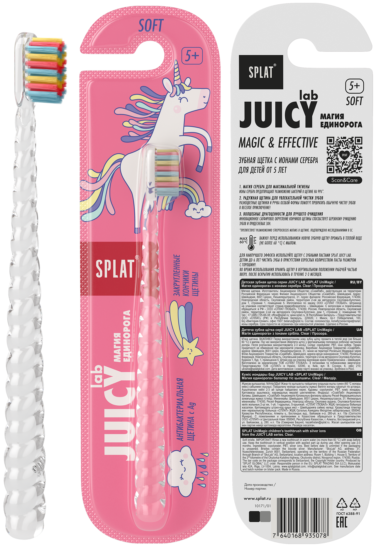 Детская зубная щетка серии JUICY LAB «SPLAT UniMagic / Магия единорога» с ионами серебра. в ассортименте, (2 шт)