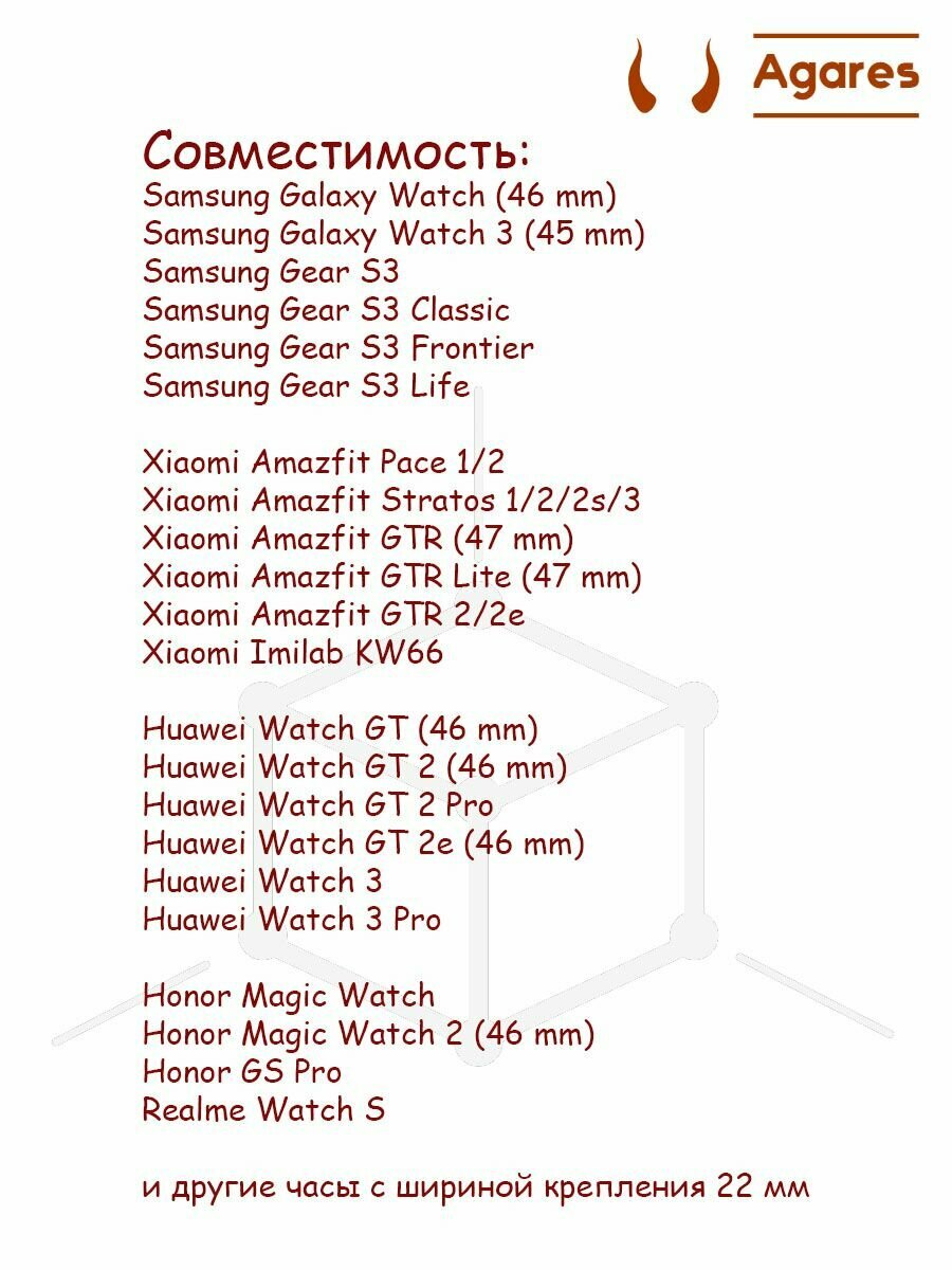 | Совместимые модели умных часов | Amazfit GTR 2, Amazfit GTR 2e, Amazfit GTR 47 мм, Amazfit GTR Lite 47мм, Amazfit Pace, Amazfit Pace 2, Amazfit Stratos, Amazfit Stratos 2, Amazfit Stratos 3, Honor MagicWatch 2 46 мм, Huawei Watch GT 2, Huawei Watch GT 2 Pro, Huawei Watch GT 2e, Huawei Watch GT 46 мм, Huawei Watch GT2 46 мм, Samsung Galaxy Watch 46 мм, Samsung Galaxy Watch3 45 мм, Samsung Gear S3, Samsung Gear S3 Classic, Samsung Gear S3 Frontier, Xiaomi Imilab KW66, универсальный |