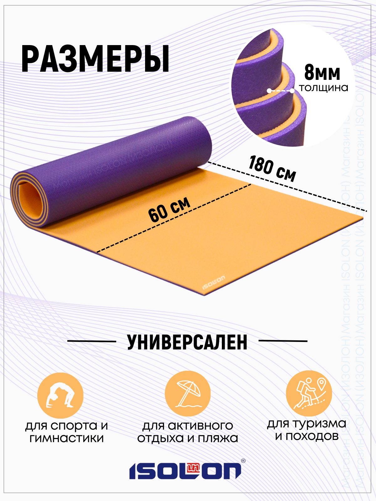 Коврик спортивный для фитнеса и йоги Спорт Универсал 8, 1800х600х8 фиолетовый/оранжевый информация: