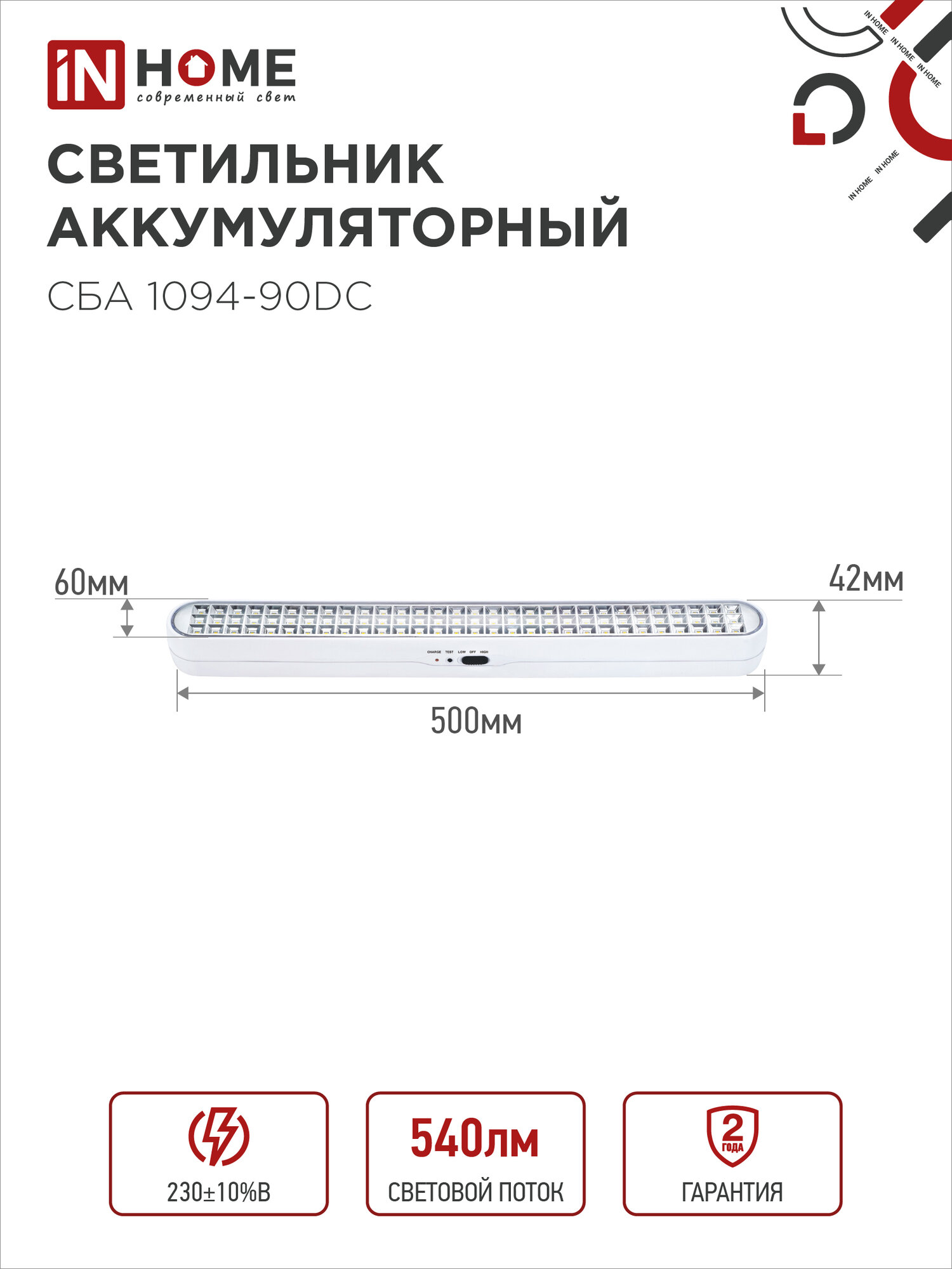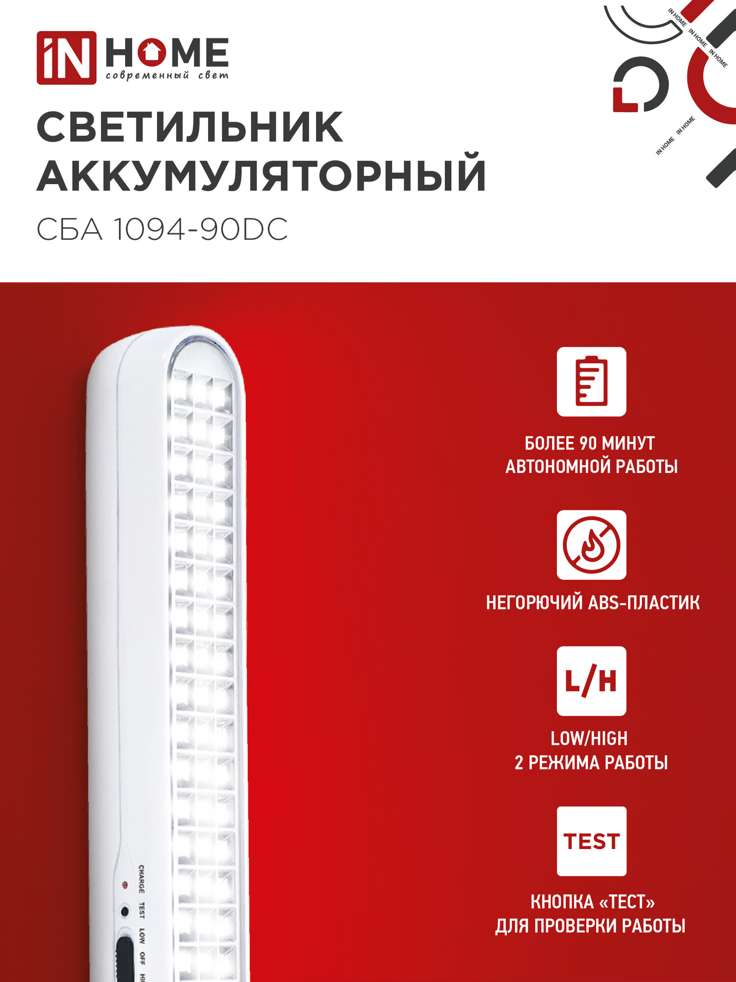 Светильник светодиодный аварийный IN HOME СБА 1094-90DC 90LED 2.0Ah lithium battery DC 4690612029467 информация: