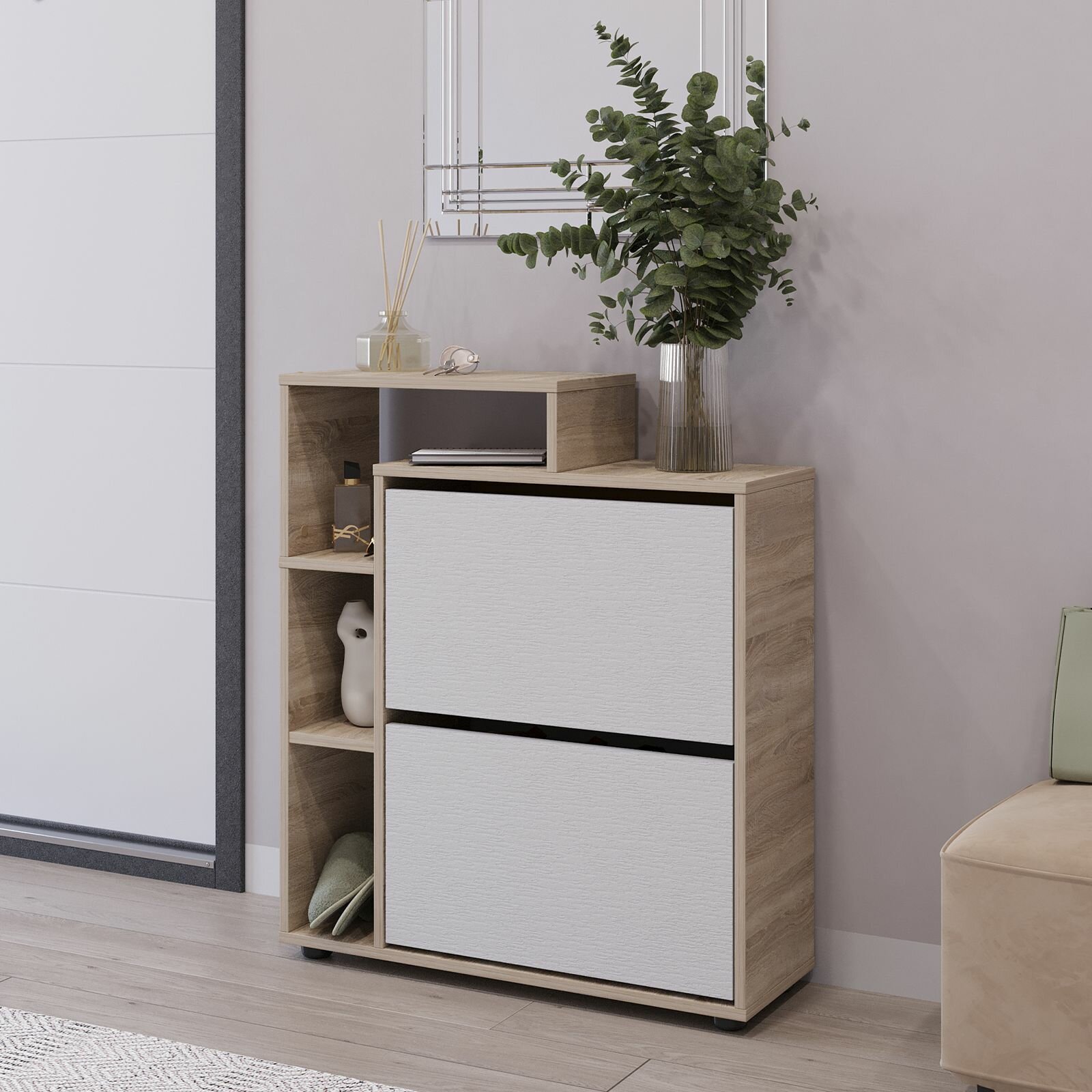 10 цен на Обувница в прихожую Ultra Plus вертикальная 2 секции Дуб сонома/Белое тисн. 750х859х246