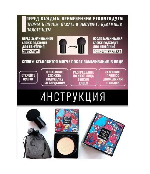 | Способ применения | 1. Очистите кожу - крем лучше наносить после умывания 2. Смочите спонж водой - так он лучше впитывает и мягче наносит крем 3. Промокните спонжем крем и аккуратно нанесите на кожу 4. Распределите крем до нужного эффекта 5. Дайте крему пару минут впитаться. |
