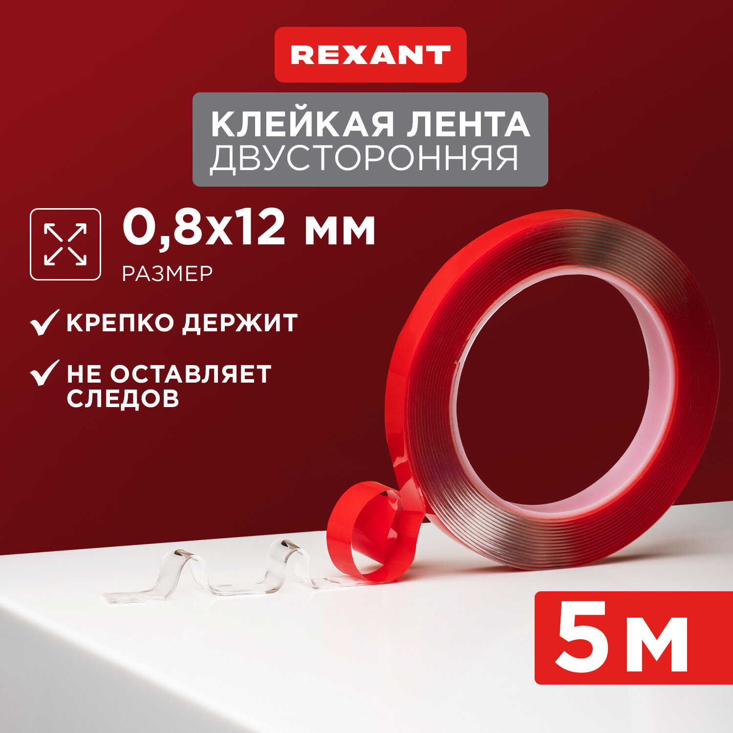 Двусторонняя прозрачная клейкая лента REXANT на акриловой основе 5 м, ширина 12 мм, толщина 0.8 мм