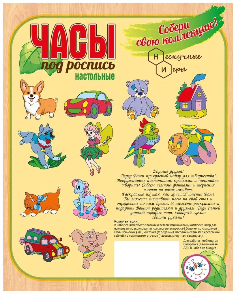 | Подробная комплектация | циферблат с пазами и вставными ножками, комплект цифр для наклеивания, акриловая гипоалергенная краска 6 цв. по 5 мл., клей ПВА 5 мл., кисточка 12-130 мм., часовой механизм с крепежной гайкой и комплектом стрелок (часовая, минутная, секундная) Для работы необходима пальчиковая батарейка АА (в комплект не входит). |