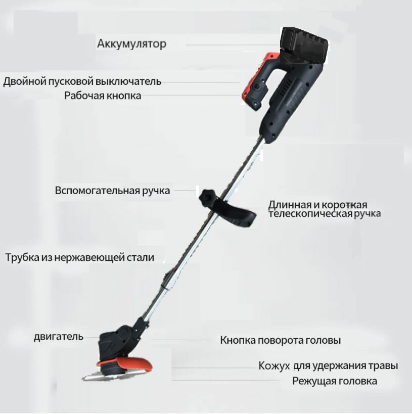 | Подробная комплектация | Триммер; 1 шт. - пильный диск; 2 шт. - металлический нож; 1 шт. - 4-х конечный нож; 10 шт - пластиковый нож; 1 шт.- леска 2 уса; 1 шт.- леска 4 уса; 2 шт - аккумулятор 21 В 36VF. 1 шт - зарядное устройство 2А; ключ; ограничитель; очки; перчатки. Инструкция. |
