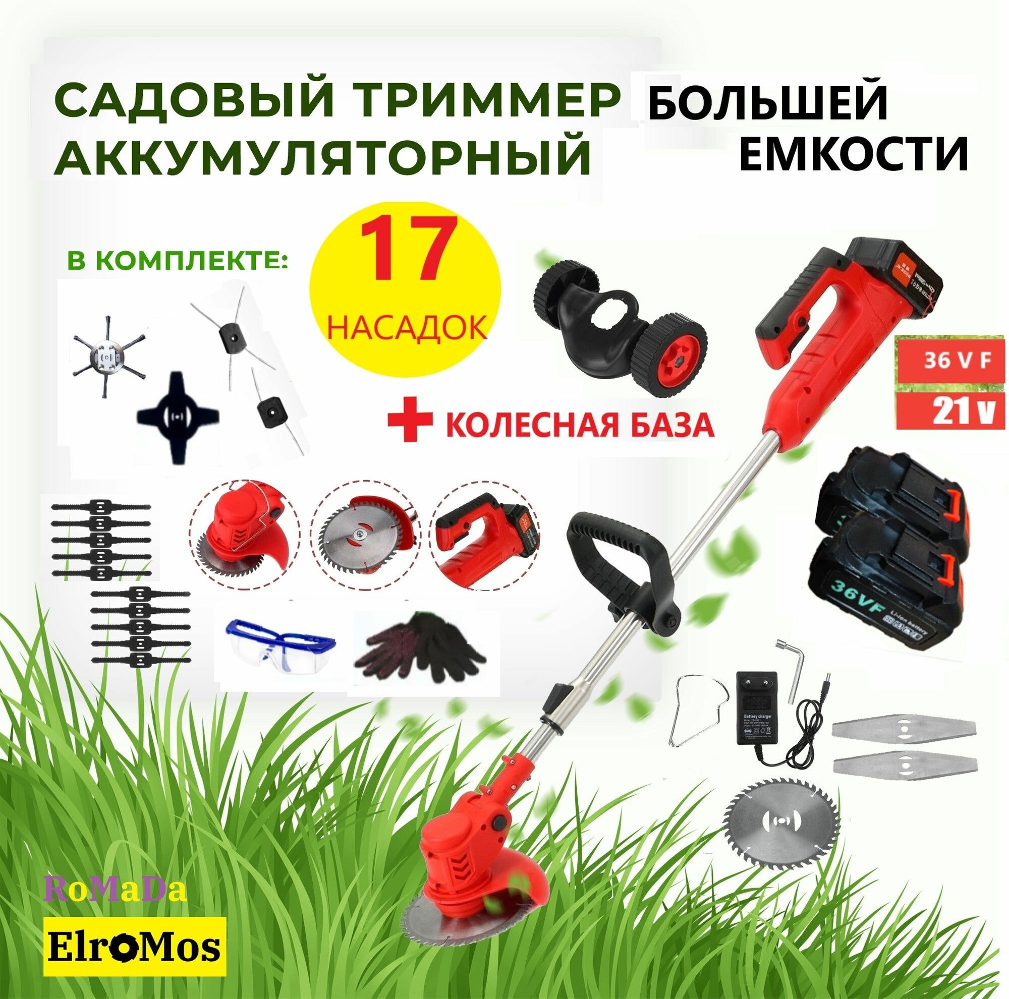 Триммер Садовый аккумуляторный 17 насадок, ElroMos, 21В, 36 VF, 2 АКБ 5 391 ₽