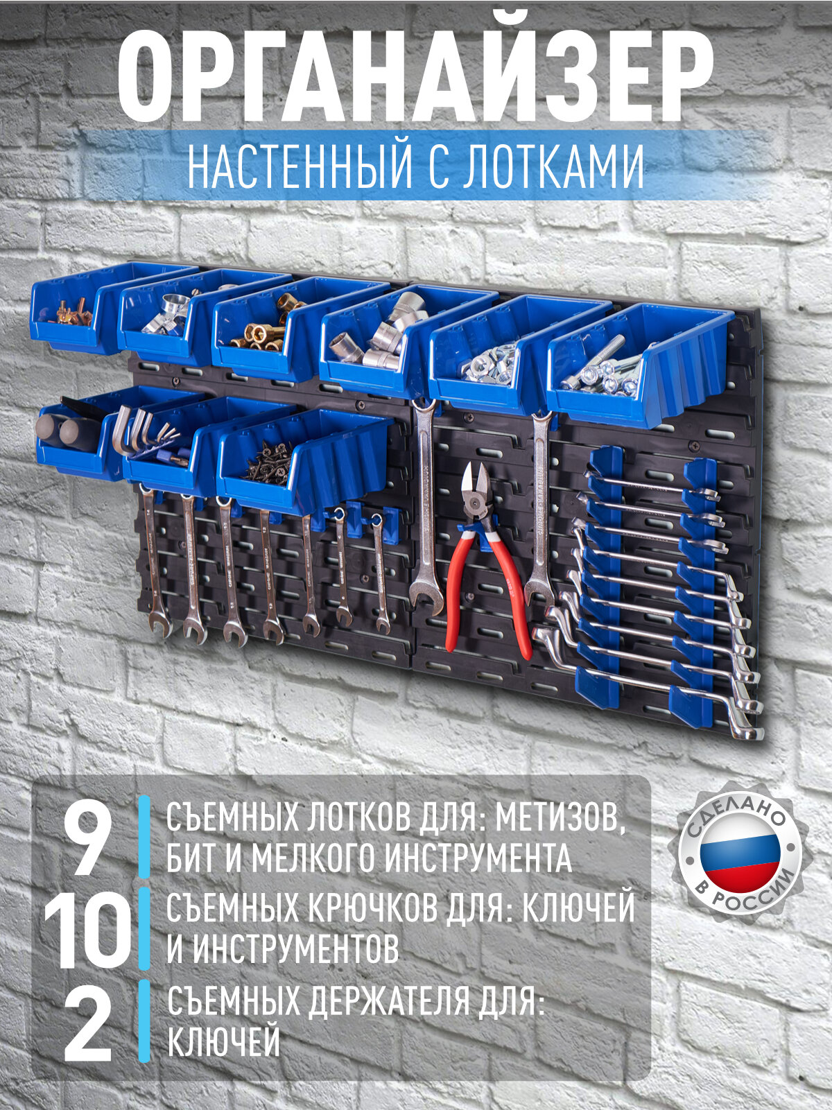 Органайзер на стену, пластиковый, лотки 9 шт. 15,5х10х7 см, для инструментов, синий, 37х2х37,5х2 см 1 400 ₽
