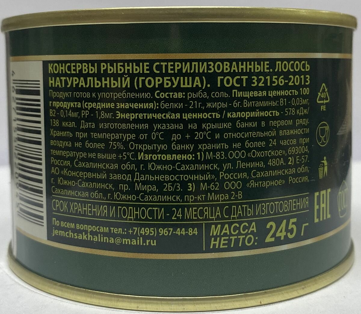 Лосось натуральный дальневосточный Жемчужина Сахалина ГОСТ 245 г - 2 штуки информация: