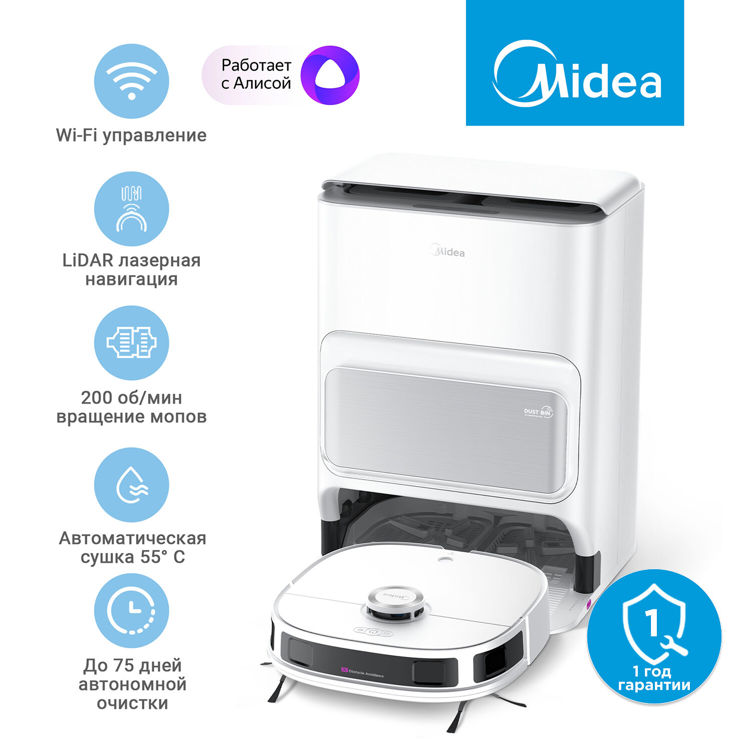Робот-пылесос с Wi-Fi Midea VCR V12 WH, автономная станция очистки, LiDAR