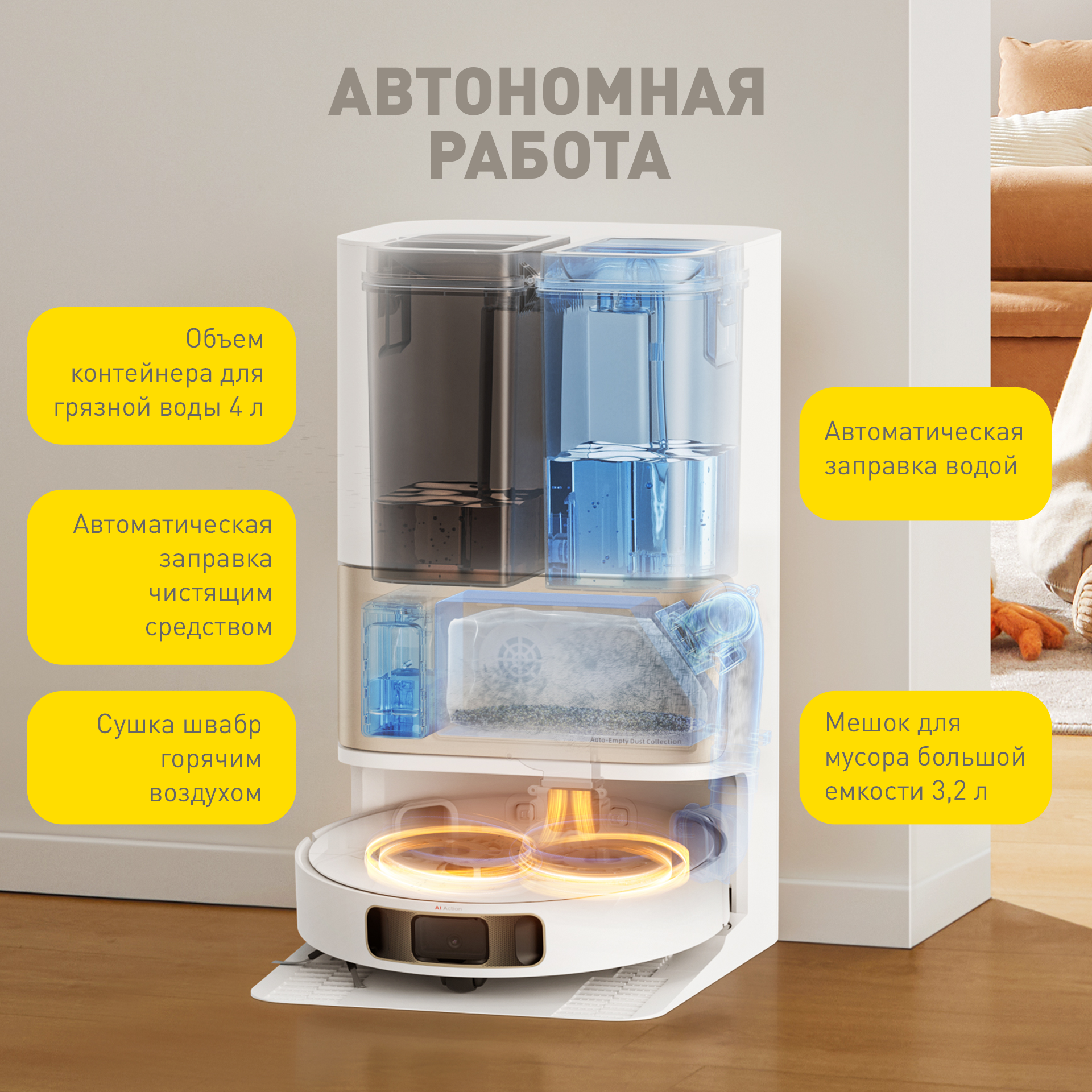 | Дополнительная информация | функция самоочистки пылесборника, автоматические чистка и сушка швабр, интеллектуальная 3D навигация, мощность всасывания 5,3 кПа, функция подъема швабры |