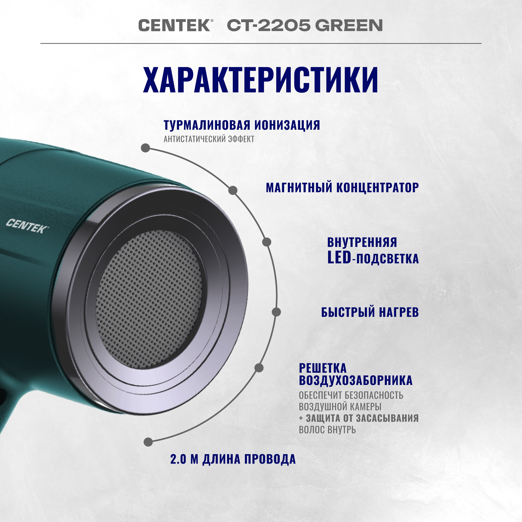 Отзывы на Профессиональный фен для волос CENTEK CT-2205 Green - 2100Вт/ 3 скорости/ 2 режима/ холод обдув/ турмалин.ионизация/ LED