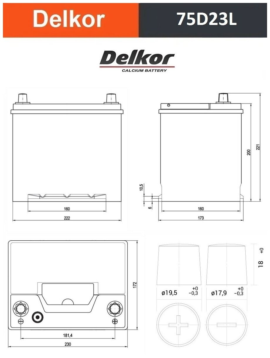 Аккумулятор автомобильный DELKOR 75D23L (6CT-65) 65 Ач, пуск. ток 570 А, обрат. полярность, 232х173х225, SMF информация: