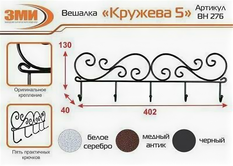 ЗМИ (Завод металлических изделий ООО) Вешалка настенная ЗМИ Кружева 5, 5 крючков, 40 x 4 x 13 см, черная 210 ₽