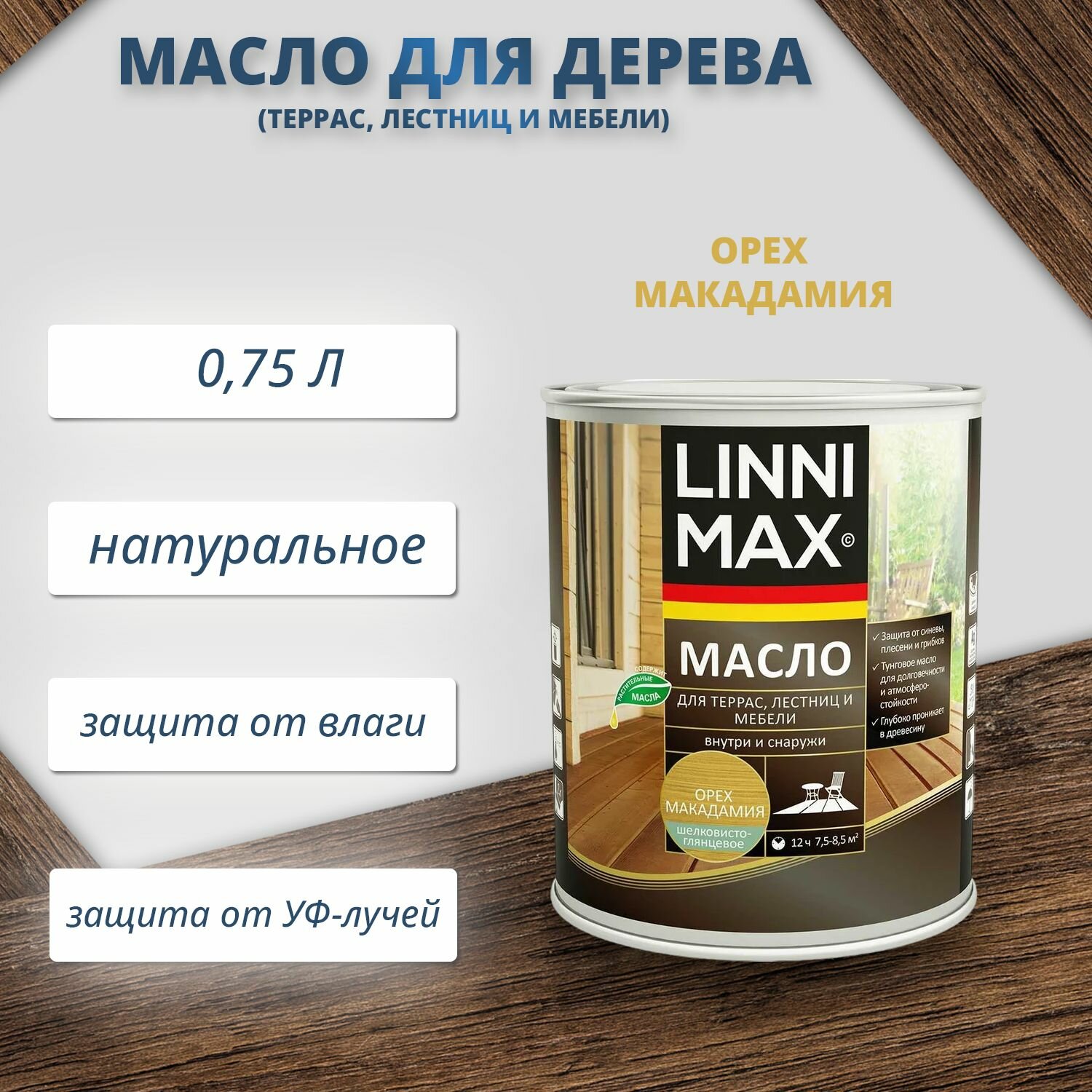 Масло для дерева (террас, лестниц, мебели) орех макадамия LINNIMAX 0,75 л 948105207 1 660 ₽