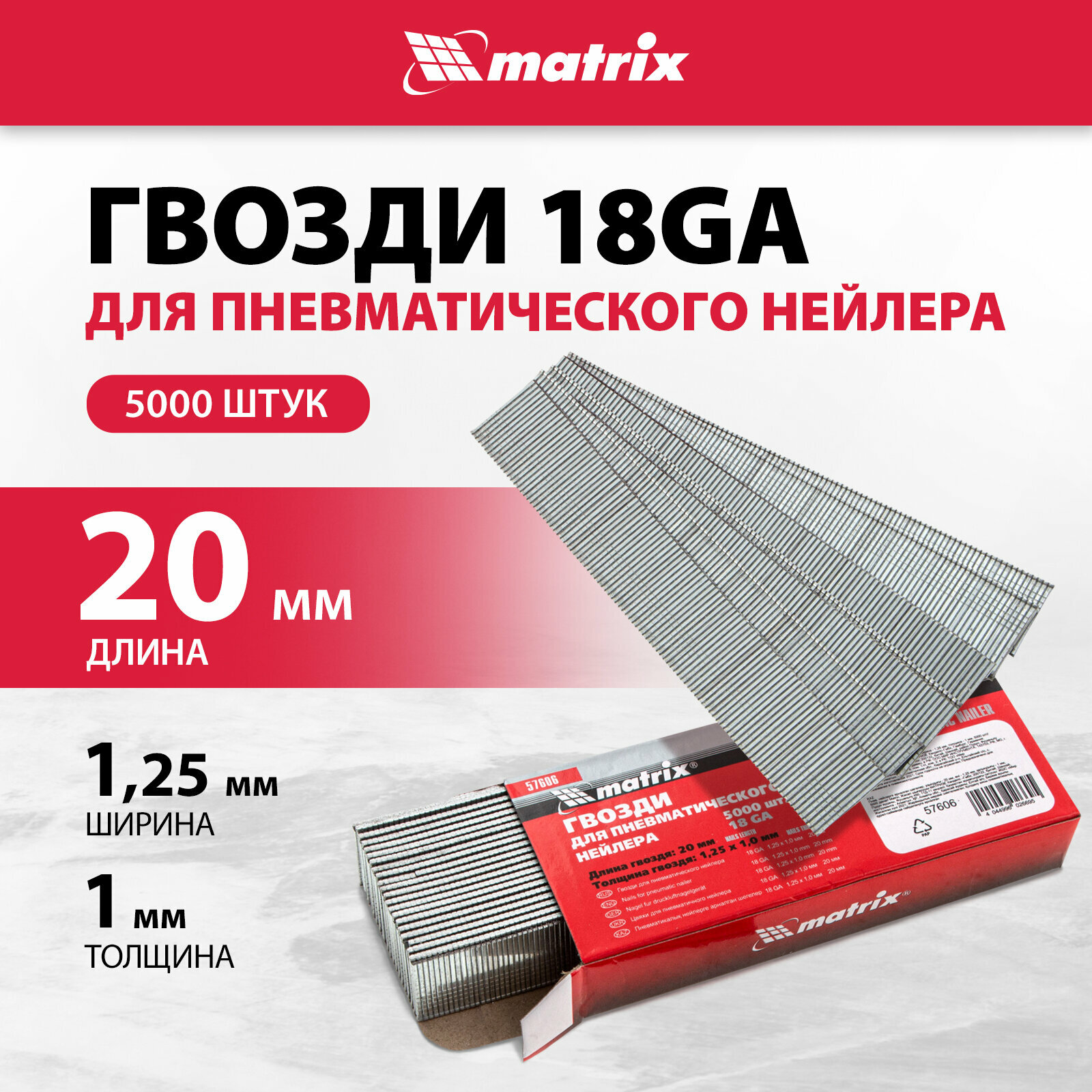Гвозди Matrix для пнев. нейлера длина - 20 мм, ширина - 1, 25 мм, толщина - 1 мм, 5000 шт 57606 информация: