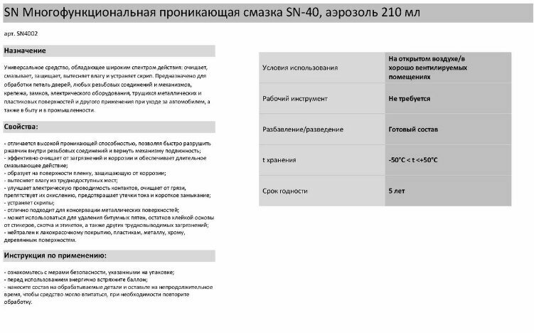 Смазка проникающая SN-40 210 мл. аэр. SYNTHETIUM SN-4002 информация: