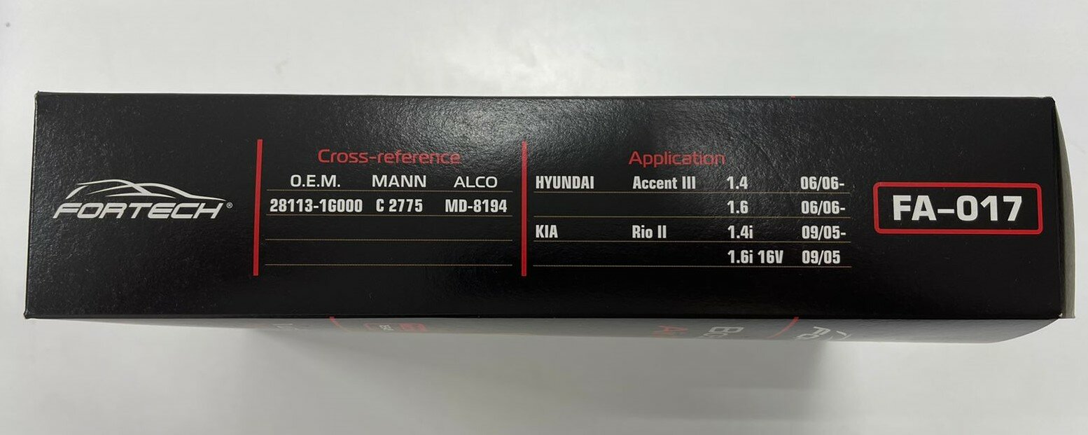 | OE-код | KIA: 28113-1G000; ACDelco: 19372633; ALCO: MD-8194; MANN: C 2775; Filtron: AP 108/6; GOODWILL: AG 349; Knecht: LX1808; MANDO: EAF00026M; SAKURA: A2845 |