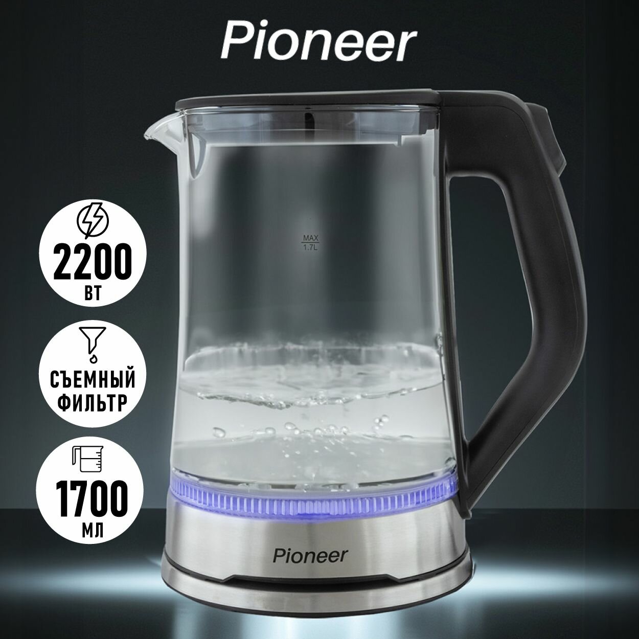 Электрический чайник Pioneer из термостойкого стекла с LED подсветкой, 1,7 л, автоотключение при закипании и снятии с базы, 2200 Вт