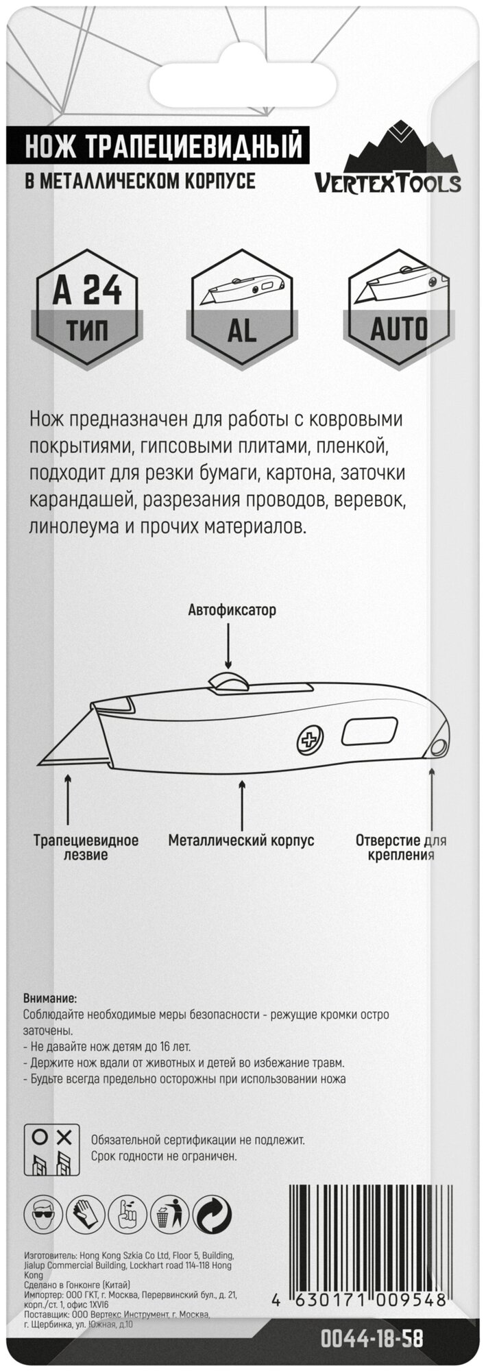 vertextools НОЖ трапециевидный В метал. Корпус 0044-18-58 информация: