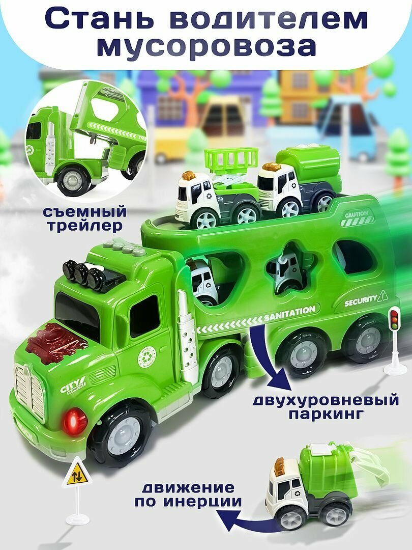 Мусоровоз 4 в 1 Play Okay набор с машинками, 6 фигурок и двухуровневый паркинг, съёмный трейлер, звуковые эффекты и функция пара, инерционный механизм движения информация: