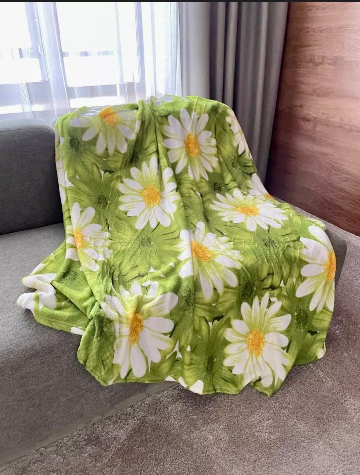 Плюшевый плед Ромашка 180x200см, 2-спальный, мягкий, тонкий, теплый, зеленое покрывало