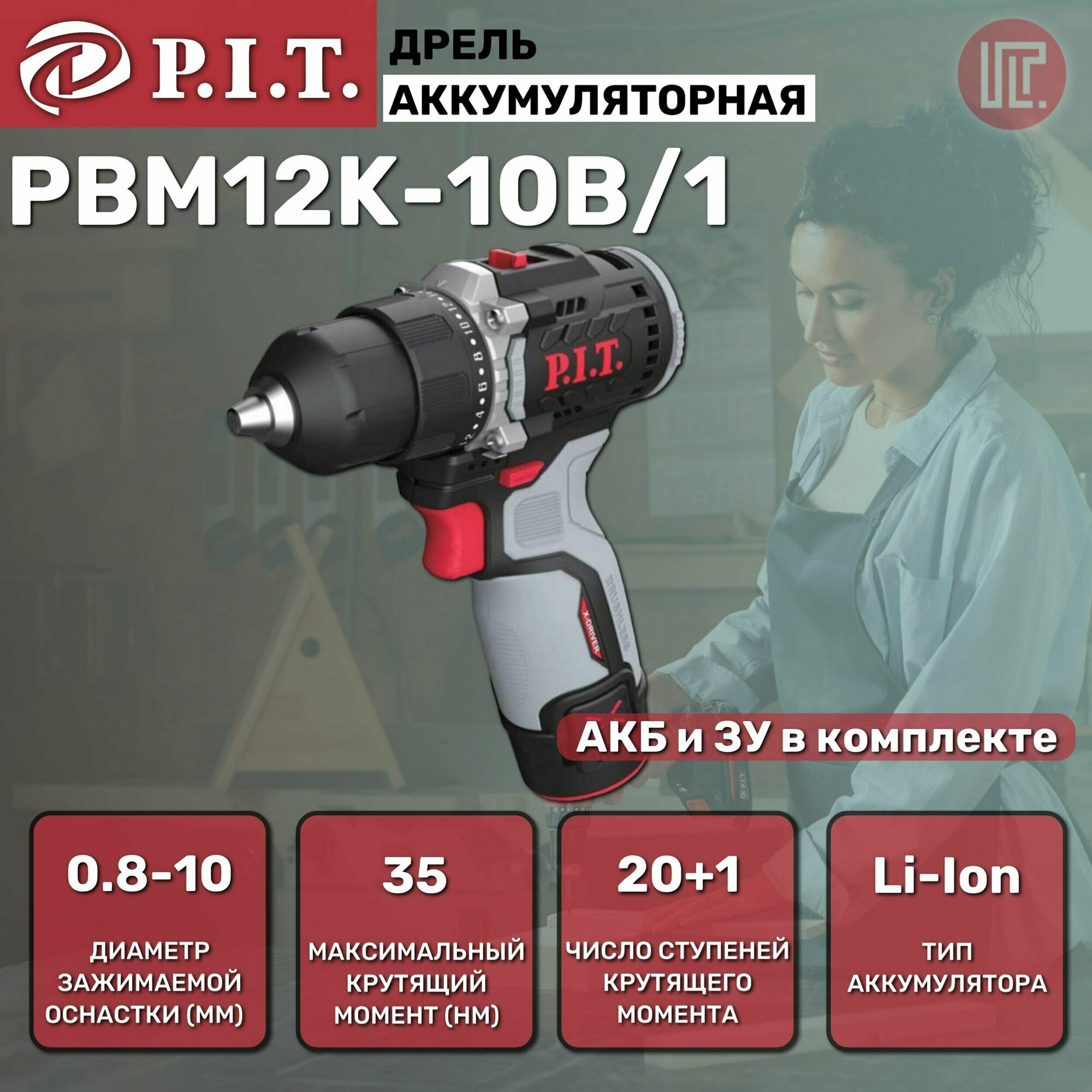 10 цен на Дрель аккумуляторная бесщеточная P.I.T. PBM12K-10B/1 12В с 1 АКБ и З/У