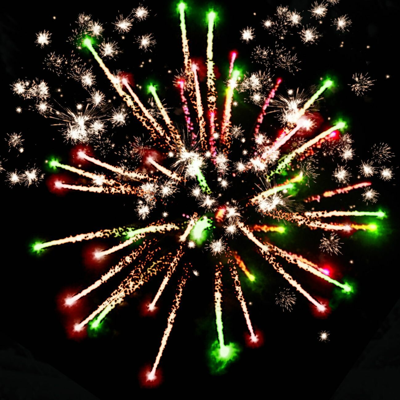 | Эффекты | разноцветные кометы разрываются сферами из: золотых мерцающих огней и золотых искристых форсов; золотых форсов / разлетающихся трещащих искр / красных и зеленых огней; синих огней и золотых искристых форсов; множества трещащих огней. |